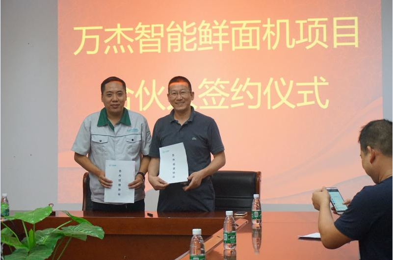 2017年7月18日,萬杰智能鮮面機項目合伙人再添二員新將,義烏市香燕食品有限公司總經理季偉先生、溫州蘇天洪先生先后與萬杰智能簽訂合作協議。此次,義烏、溫州二市的加入,標志智能鮮面機招商工作在南方市場取得初步成績,也為進一步走向全國開了個好頭。截止現在,近半個月內,赤峰、新鄉、鄭州兩個區域、鶴壁、寧波、義烏,溫州相繼簽約,萬杰智能鮮面機全國招商工作屢創佳績,迎來“開門紅”。