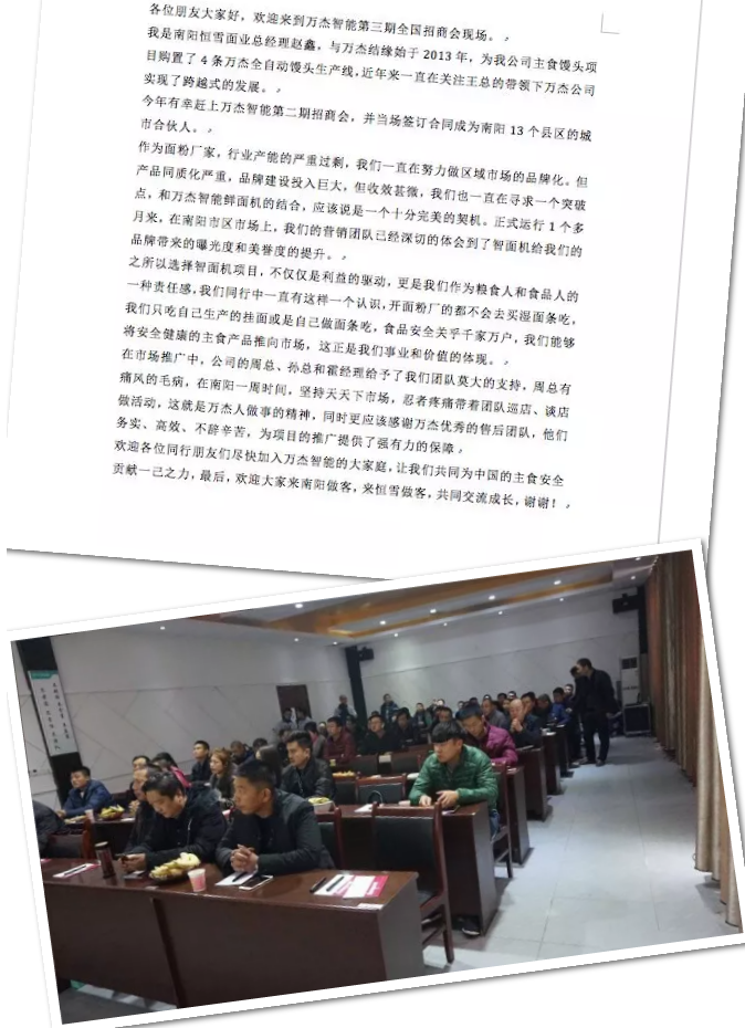| 2017年12月29日,萬杰智能鮮面機(jī)第三期全國招商會和中型生產(chǎn)線新品發(fā)布會同時在萬杰智能總部召開。在新的一年即將到來之際,眾多經(jīng)銷商和糧油界的朋友們寄托新的希望,齊聚萬杰展望未來,共謀未來發(fā)展新商機(jī)。 為了讓嘉賓們能夠更加深入的了解萬杰智能,主辦方特地安排嘉賓在招商會當(dāng)天上午參觀萬杰智能工廠,從生產(chǎn)制造中心、研發(fā)中心、產(chǎn)品展示廳到遠(yuǎn)程控制中心,使嘉賓們充分了解萬杰智能的研發(fā)能力和制造實(shí)力,深切感受到萬杰智能20年的積累。 經(jīng)過午餐和簡單的茶歇,嘉賓們齊聚萬杰招商會現(xiàn)場,萬杰智能第三期全國招商大會正式開始。會上,首先由北京先行曾鵬飛為意向合伙人做萬杰智能鮮面機(jī)的項(xiàng)目介紹;然后由萬杰智能科技股份有限公司王曉杰董事長做“傳統(tǒng)還在,未來已來”主題報(bào)告;最后由來自南陽和新鄉(xiāng)的城市合伙人為意向合伙人分享市場心得和運(yùn)營經(jīng)驗(yàn),涵蓋了從終端洽談、現(xiàn)場陳列、消費(fèi)者溝通等眾多細(xì)節(jié),內(nèi)容豐富全面,引來現(xiàn)場不少嘉賓的共鳴。 由于萬杰智能鮮面機(jī)擁有出色的產(chǎn)品力和科學(xué)的商業(yè)模式,現(xiàn)場不少嘉賓都對萬杰智能鮮面機(jī)項(xiàng)目產(chǎn)生了濃厚的興趣。目前,萬杰智能的相關(guān)工作人員正在和有合作意向的嘉賓就合作細(xì)節(jié),進(jìn)行深度的商談接洽。 本次招商會的順利召開,為中國的傳統(tǒng)制造行業(yè)注入了一股新的活力。未來,萬杰智能將繼續(xù)堅(jiān)持科技智能創(chuàng)新,為中國的老百姓創(chuàng)造更多更好的智能主食機(jī)械,為中國億萬家庭的主食安全保駕護(hù)航。 招商會花絮 |