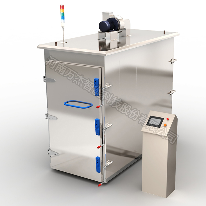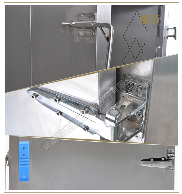 蒸柜的內外表面采用優質不銹鋼材料制造,符合衛生要求;蒸柜內裝有產品中心溫度探測器,可有效的觀測到產品中心的溫度狀況,自動化程度高;蒸柜密封選用耐高溫硅膠材料,密封性能好;門板保溫采用耐高溫聚氨酯注入發泡而成,既輕巧有保溫;柜身保溫選用珍珠巖等混合材料,堅固、扎實;蒸汽管道保溫選用高密度巖棉+鋁外殼裝飾;蒸柜配有獨立不銹鋼抽風機機組;前后柜門口下配有不銹鋼手動升降斜坡各一個,方便蒸車進出;蒸汽疏水閥選用進口優質產品;蒸柜內部上頂用不銹鋼弧形搭襯,凝結水可順壁下流,無衛生死角,方便清洗。